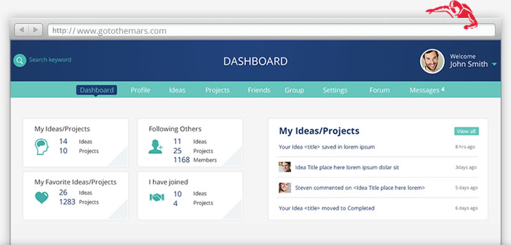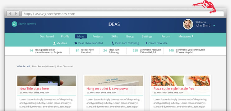 The dashboard is a portal that gives you a quick access to the ideas/projects you have created and those you choose to follow or favorite; and the ideas of which you are invited to join in a private discussion, or the projects of which you are a team member. Also on the dashboard you can share anything you have learned with your friends and followers and see the updates from them in "Share what you have learned lately".