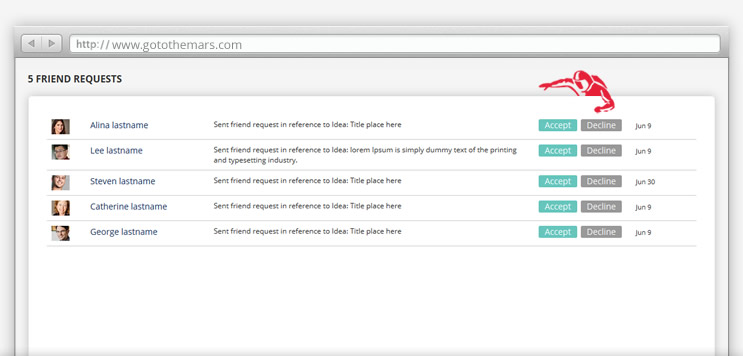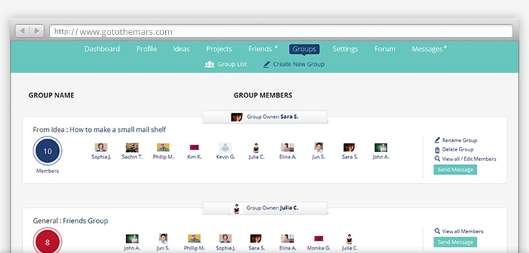 When you send a "friend request"associated with one of your ideas/projects to another user, a group will be automatically formed. More group members will be added to that group in the same manner when you send more friend requests. If some other user sends you a "friend request"associated with one of your ideas/projects, a group under the name of that idea/project will also be created if it hasn't been created by you yet. In either case, the owner of the idea/project will be the owner of that group. The group owner can edit the group member list under the Group Tab. All other group members can only view the members and send messages to them.