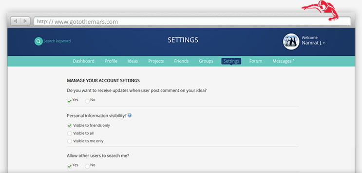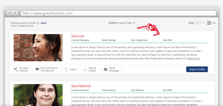 To search for users, go to the search box on the upper left part of the page and select "user"from the drop box, type in keywords or the name of the user and click search. To search an Idea/Project select "Idea/Project"from the drop box, type in the key word or the name of the idea and click search. Check the advanced search option if you wish to search by more options.